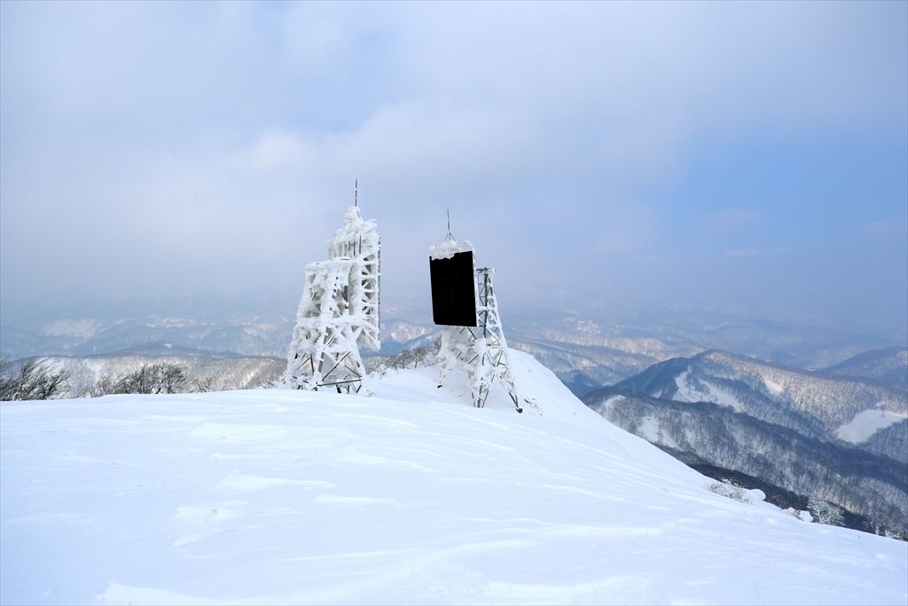 爆風の中ようやく山頂につきましたが秋田駒ケ岳と岩手山は見えず反射板が寒そうに踏ん張ってました。